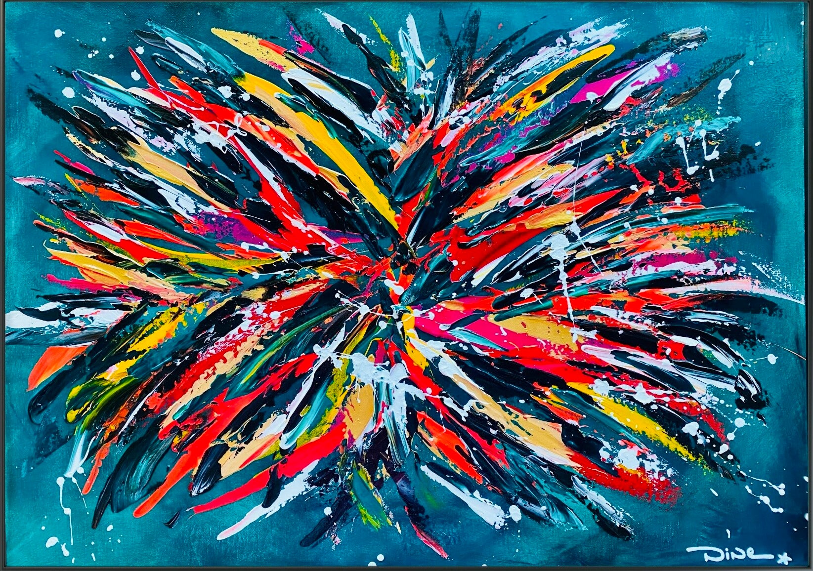 Sur la tranche de la toile côté droit, une étoile blanche représentant mon logo, et sur la tranche côté gauche, une bande de couleur.